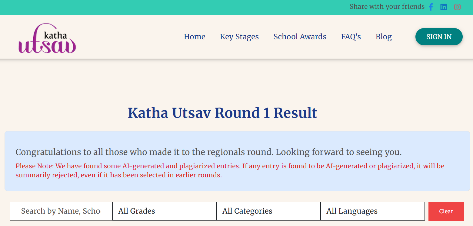 Head over to https://utsav.katha.org/results to find your name and celebrate! The lightning search is super easy—type in your name or school, and you'll instantly see if you've made it through. Prefer to filter by grade, category, or language? We've got you covered with handy filter options that make finding your results a breeze.